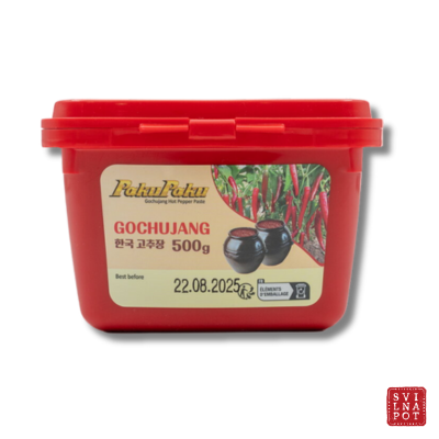 Gochujang (izgovori se “go-ču-džang”) je fermentirana korejska čili pasta, narejena iz mešanice korejskega čilija (gochugaru), lepljivega riža, sojinih zrn in soli. Njena posebnost je v tem, da med fermentacijo razvije bogato, rahlo sladkasto, sadno-cvetlično aromo, ki jo ne boste našli pri nobeni drugi pekoči omaki.