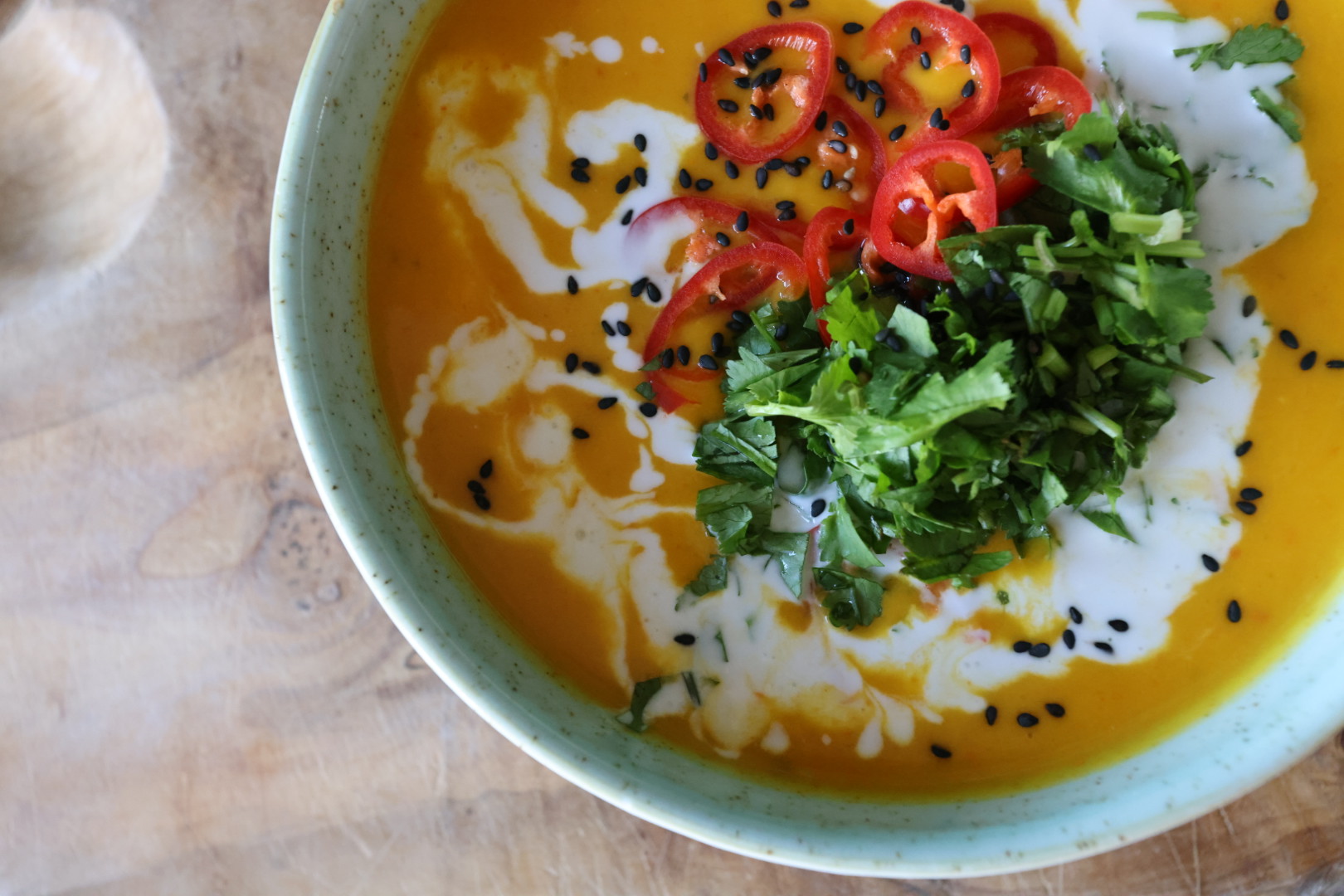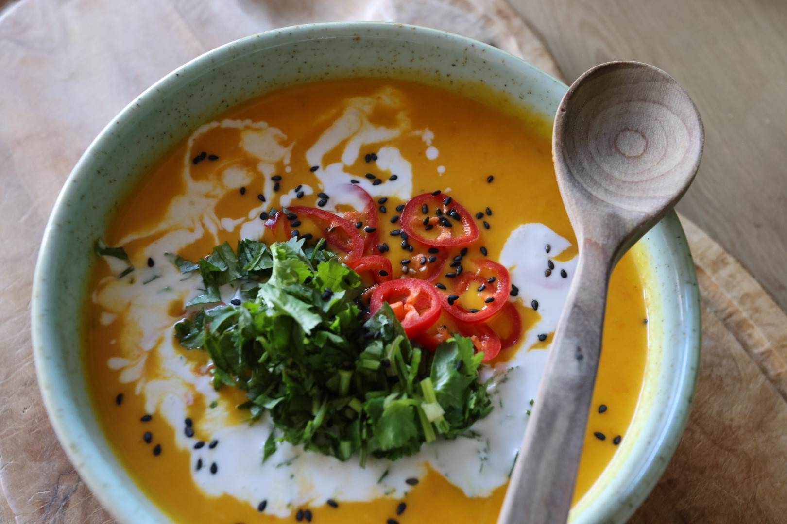 - Serviramo v krožnike, prelijemo s kokosovim mlekom in okrasimo s feferonom in zvrhanim ščepcem koriandra. Če nam koriander ne paše, ga lahko zamenjamo s peteršiljem.