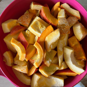 - 1,6 - 1,8 kg očiščene in na kocke narezane hokkaido buče