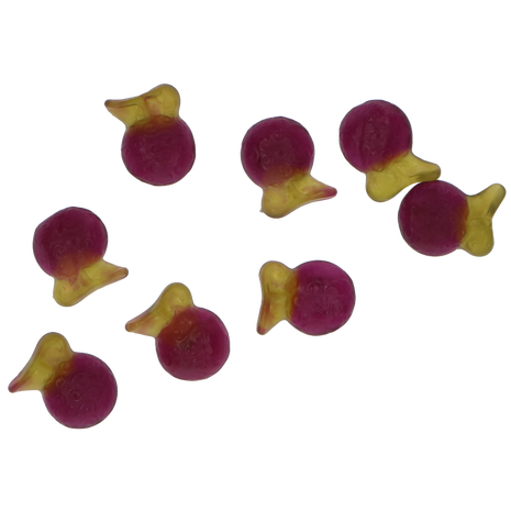SESTAVINE: glukozni sirup, sladkor, goveja želatina, voda, sredstvo za uravnavanje kislosti: E330, naravna aroma grozdja, naravna barvila: izvleček kurkume, izvleček sladkega krompirja, koncentrat jabolka, koncentrat redkve, koncentrat češnje, barvila: jedilno oglje, briljantno modra, glazirno sredstvo: karnauba vosek.