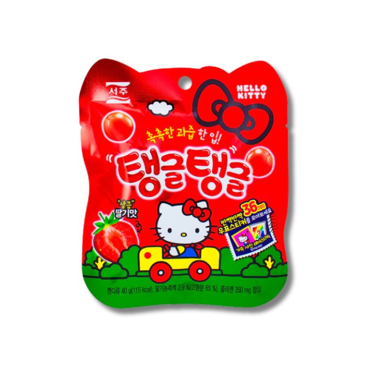 SESTAVINE: koruzni sirup, sladkor, raztopina D-sorbitola, izvleček jagod, zgoščevalec: E418, jedilni kolagen, aroma jagode, kislina: E330, E296, antioksidant: E331, E327, predelana jedilna maščoba, barvilo: izvleček jagodičevja, sladilo: E955, zgoščevalec: E415, E410, gumi iz zrn indijskega trpotca, pektin, mešanica (glicerin, paprika oleoresin, glicerinovi estri maščobnih kislin, prečiščena voda, beta karoten, antioksidant, predelano sadje in zelenjava.