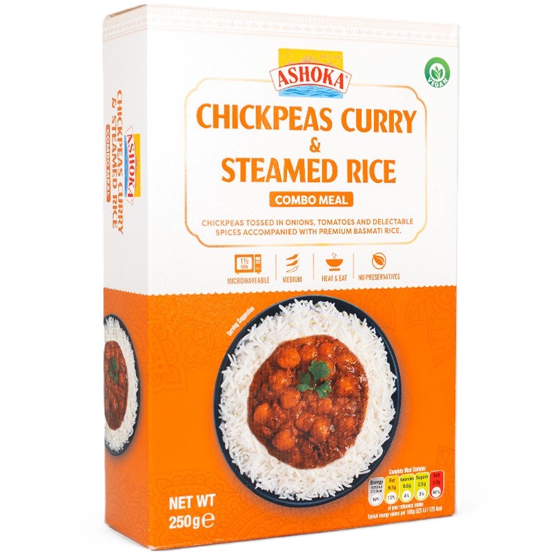 SESTAVINE: Čičerikin kari 60%: voda, čičerika 14 %, čebula 10 %, sončnično olje, česen, paradižnikov koncentrat 1,4 %, sol, ingver, koriandrovi listi, začimbe, cel čili, kumin, koriander, koromač, črna sol. Parjeni riž 40 %: voda, basmati riž 19 %, sončnično olje, sol.