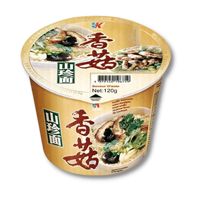 SESTAVINE: Rezanci: pšenična moka, palmino olje, modificirani tapiokin škrob, sol, česen, sredstvi za uravnavanje kislosti: E500, E501. Začimba: sol, sladkor, ojačevalci arome: E621, 627, E631, gobe šitake, (Lentinus edodes), sojina omaka v prahu (soja, maltodekstrin, barvilo: E150a, ojačevalca arome: E627, E631, sol), sojine beljakovine, ingver, česen, poper, barvilo: E150c, drobnjak, sredstvo za zgostitev: E1440. Omaka: palmino olje, aroma šitake gob. Sušena zelenjava: zelje, korenje, šitake gobe (Lentinus edodes), šalotka.
