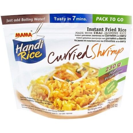 SESTAVINE: dehidrirani jasminov riž 78 %, posušena zelenjava (korenje, mlada čebula), palmino olje, posušeni rakci (3,5 % sladkor, sol, začimbe (česen, kurkuma, kumin, cimet), ojačevalci arome (E621, E635), kari v prahu 0,56 % (koriander, kurkuma, kumin, klinčki, grško seno, lovorjevi listi, cimet, zvezdasti janež, čili), izvleček kvasa, kokosova smetana v prahu, (kokosov izvleček, glukozni sirup, sredstvo za uravnavanje kislosti (E340(i)), sredstvo proti strjevanju (E551)), čili v prahu, aroma).