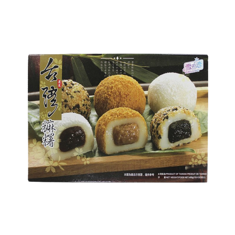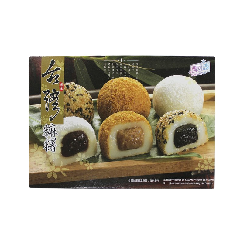 SESTAVINE: Sezamovi mochi: maltoza, sezamova pasta 20% (sezam 53.2%, arašid, rdeči fižol, sladkor, glukoza, emulgator: E471, sojino olje, aroma, sol), lepljivi riž v prahu 15.2%, sladkor, sezam 3%, voda, konzervans: E200, emulgator: E471, sredstvo za zgostitev: E415. Arašidovi mochi: maltoza, arašidova pasta 19.5% (arašid 88.1%, sladkor, sojino olje, sol, aroma), lepljivi riž v prahu 15.2%, sladkor, arašid v prahu 2.5%, voda, sojina moka, glukoza, emulgator: E471, konzervans: E200, sredstvo za zgostitev: E415. Mochi rdeči fižol: maltoza, pasta rdečega fižola 20% (rdeči fižol 42.6%, maltoza, sladkor, sojino olje), lepljivi riž v prahu 15.2%, sladkor, krompir v prahu, voda, konzervans: E200, emulgator: E471, sredstvo za zgostitev: E415.