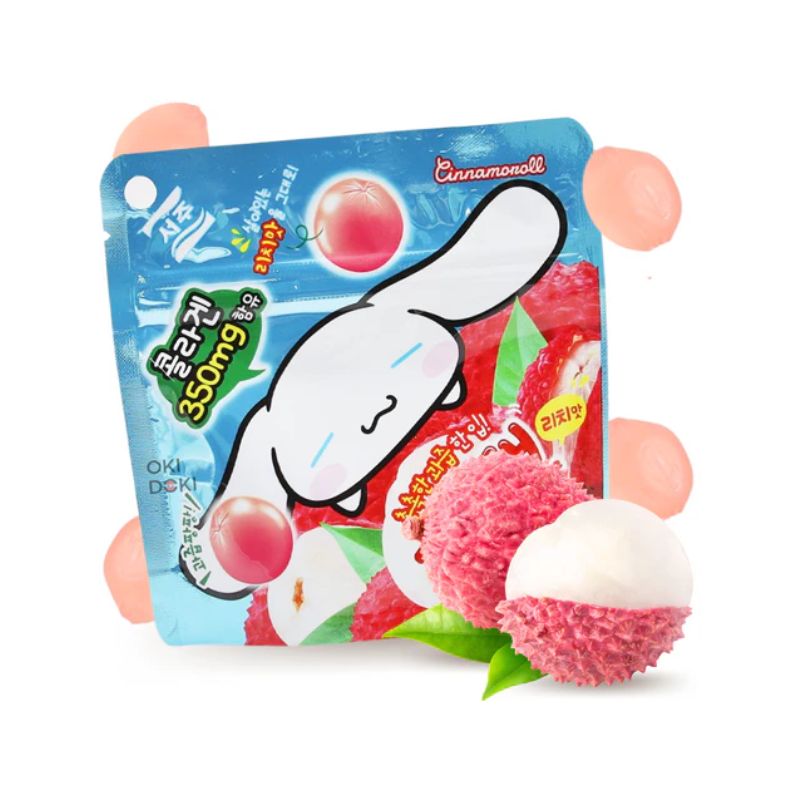 SESTAVINE: koruzni sirup, sladkor, raztopina D-sorbitola, ličijev koncentrat, ovojnica jedilnega kolagena, sredstvo za uravnavanje kislosti: E330, antioksidant: E331, emulgator: E418, aroma ličija, antioksidant: E327, jedilna olja in masti, zgoščevalci: E415, E410, E440, gumi iz zrn indijskega trpotca, barvilo: E163, predelani izdelki iz sadja in zelenjave.