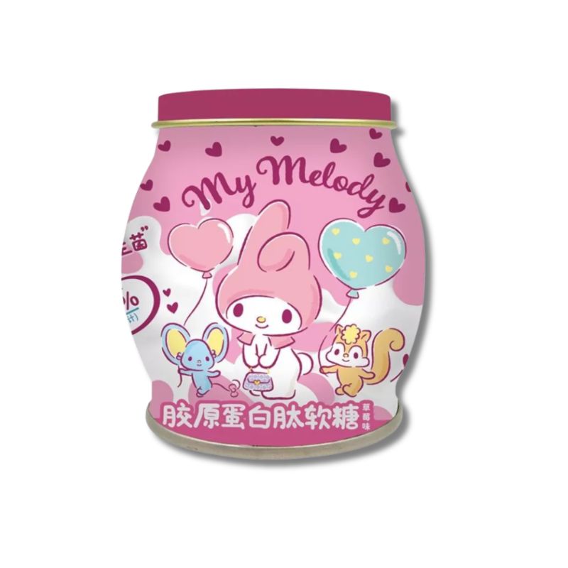 Razvajaj svoje brbončice in poskrbi za lepoto od znotraj z gumijastimi bonboni s kolagenom v ikonični My Melody pločevinki. Vsak grižljaj prinaša sladek okus sočnih jagod in hidroliziran kolagen, ki podpira elastičnost kože, sijaj in mladosten videz.