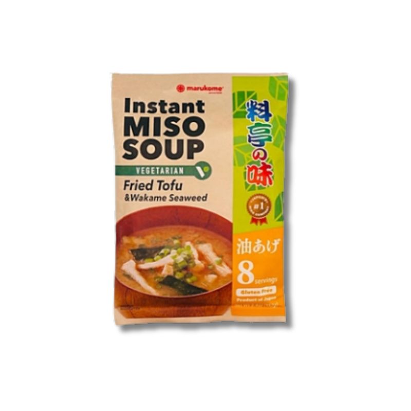 SESTAVINE: Sojina pasta (miso): sojina pasta (voda, sojina zrna, riž, sol), voda, alkohol, sladkor, hidrolizirane beljakovine (soja), izvleček kvasa v prahu (izvleček kvasa, dekstrin), sol, izvleček čebule, izvleček alg (alge, sol, glukozni sirup), izvleček gob šitake (izvleček gob šitake, dekstrin). Posip: posušeni ocvrti tofu 4 % (sojina zrna, palmino olje, škrob, sol, glukoza, sojino olje, utrjevalci: E516, E511, E575), posušene alge vakame 2 % (vakame, sol), posušena mlada čebula (mlada čebula, glukoza)).