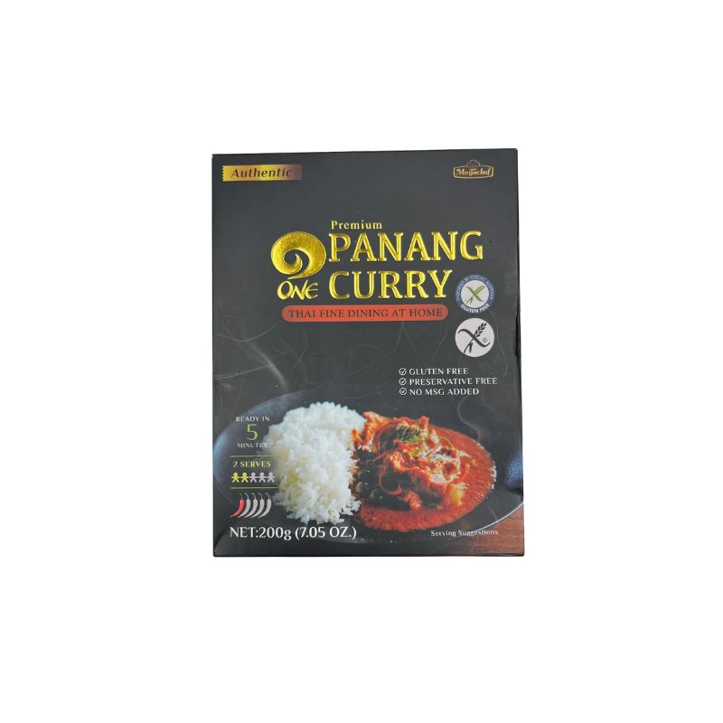 SESTAVINE: kokosovo mleko 70 %, panang karijeva pasta 17 % (rdeči čili, limonska trava, česen, šalotka, galangal, sol, koriandrova korenina, kombava), ribja omaka (inčuni, morska sol, sladkor), mešanica sladkorjev (trsni, kokosov sladkor).