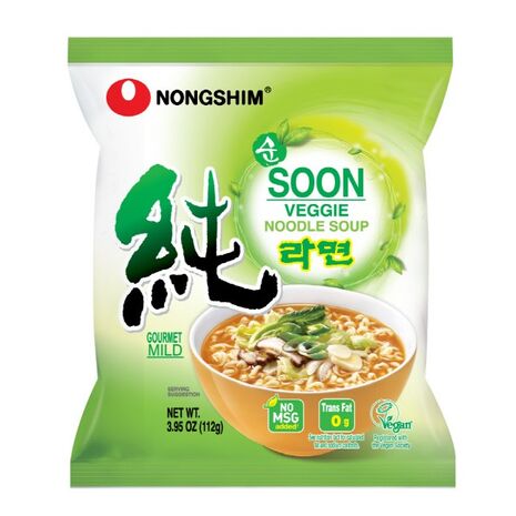 SESTAVINE: Rezanci: pšenična moka (ZDA), palmino olje, krompirjev škrob, modificirani krompirjev škrob, sol, sredstvo za uravnavanje kislosti: E501, E399, E500, začimbe (izvleček kvasa, sojina omaka, česen), tokoferolna tekočina (antioksidant: E306, emulgator: sojin lecitin), izvleček zelenega čaja (oligosaharidi, izvleček zelenega čaja, kislina: E330, barvilo: E101. Jušna osnova: začimbe (hidrolizirana zelenjavna beljakovina (soja), maltodekstrin, izvleček kvasa, sol, sojina omaka, sojina zrna, sladkor, pšenična moka), začimbe (maltodekstrin, česen, paprika, sol, črni poper, ingver, čebula, zelena čebula), sol, sladkor, ojačevalci arome: E631, E627, maltodekstrin, gobe šitake, kislina: E330. Zelenjavni kosmiči: sušeni čoj sum, sušeno korenje.